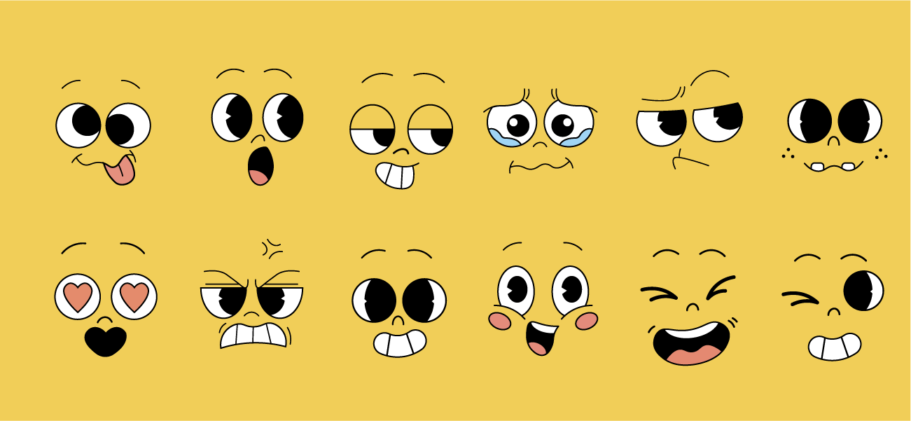 L’objectif est de construire un personnage identifiable et modulable, pensé pour l’animation. Moji a vocation à devenir le fil conducteur d’un futur projet de motion design, notamment dans le cadre du Motion Tober 2026. Ce travail me permet d’anticiper des situations, des émotions et des interactions variées. Sur cette page, je présente plusieurs variations du visage du personnage ainsi que des environnements dans lesquels il pourrait évoluer.